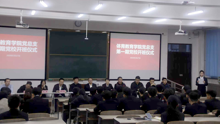 3月27日晚,体育教育学院党总支在教学楼114教室举行2026年春季学期入党积极分子培训班开班式。体育教育学院领导班子、学生党支部书记和辅导员出席开班式,仪式由学生第四党支部书记、2025级辅导员洪宗鹏主持。
